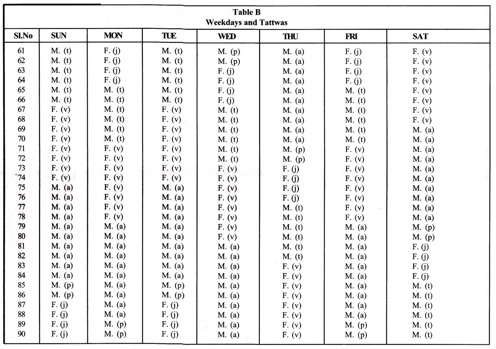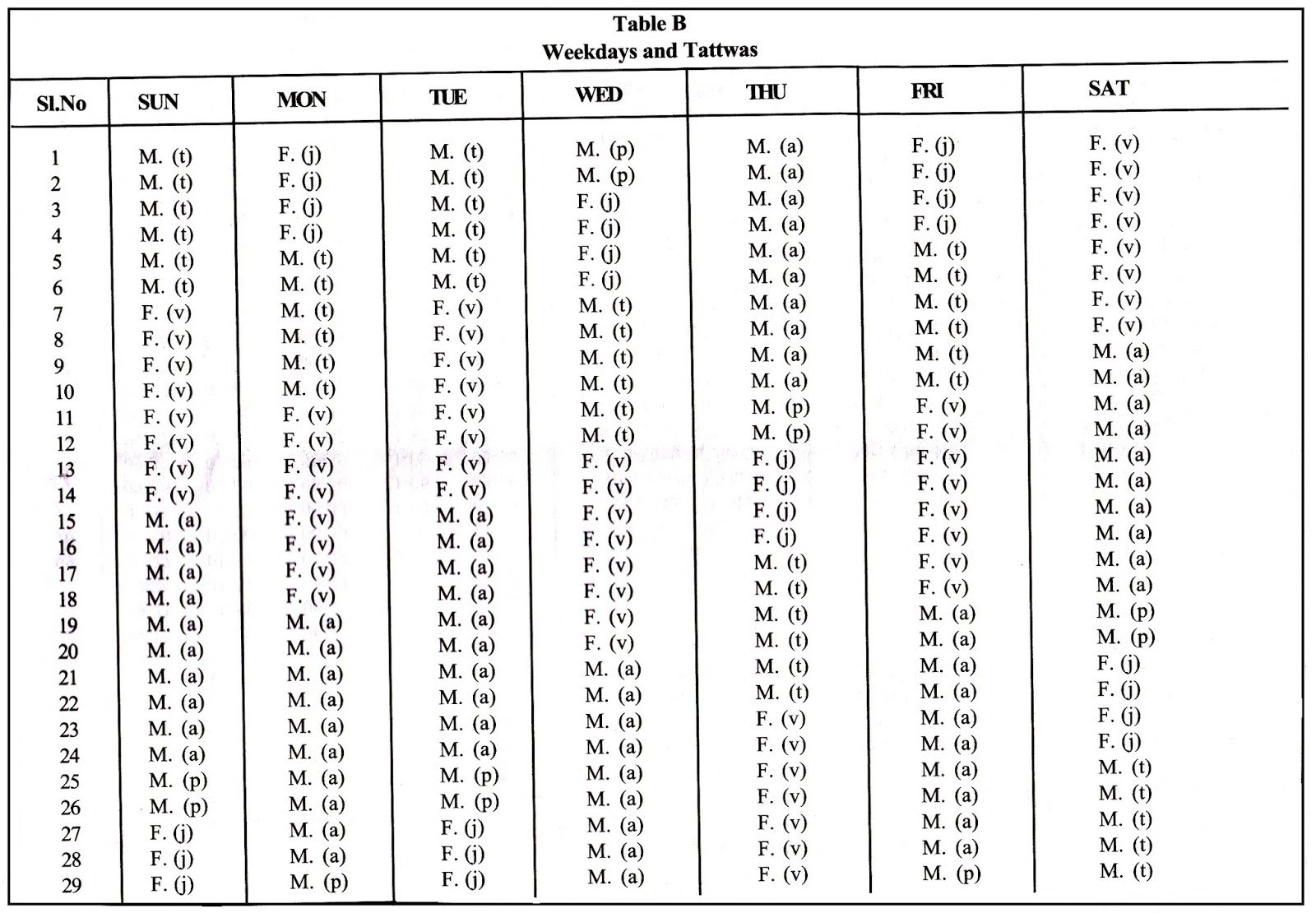 For example, look for Tuesday. The Table shows M(t) as beginning from 06-03 a.m. and lasting till 06-21 a.m. However, it can be seen this 06-21 a.m. is noted as F(v). So it has to be taken as M(t) lasts till the 20th minute is over and the next F(v) commences just after 06-21 a.m.