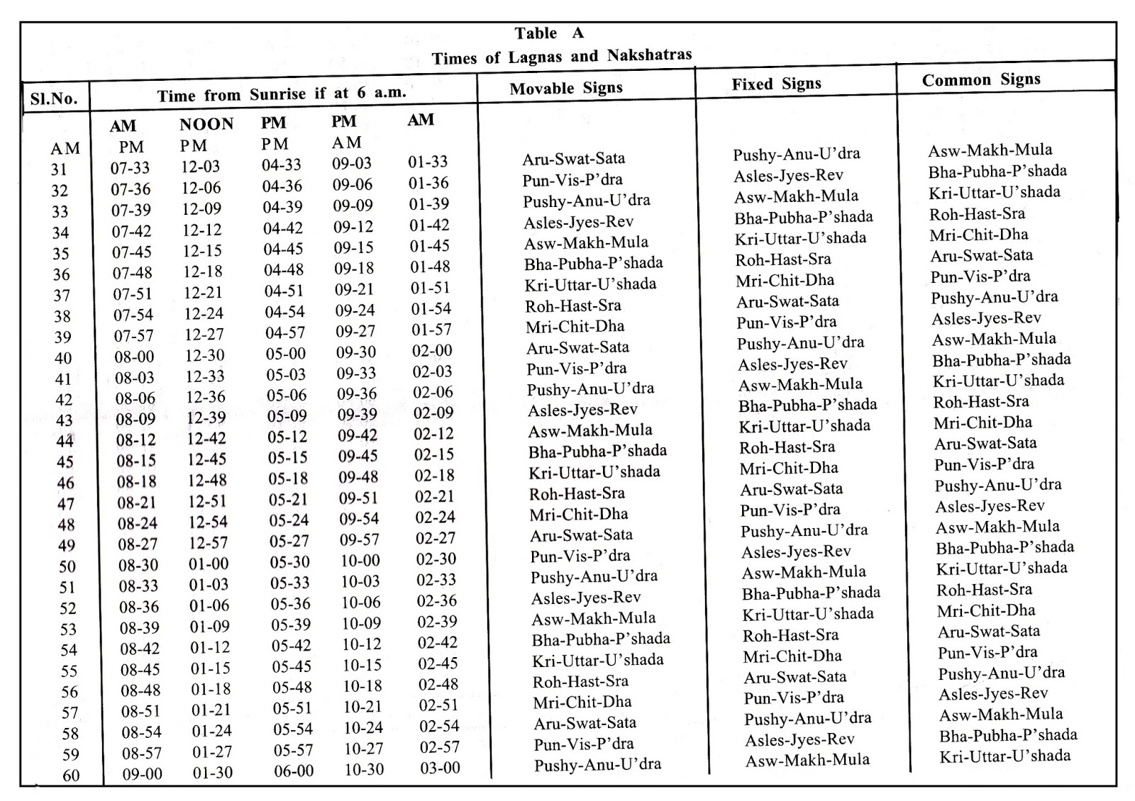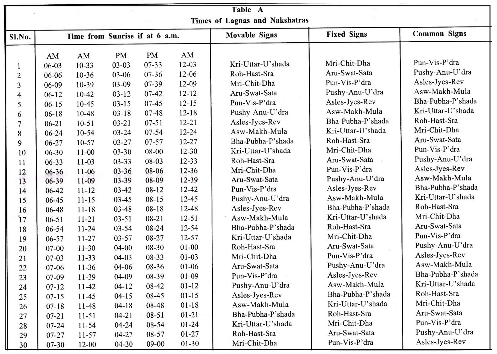 If birth occurs after 04-30 a.m. and before next sunrise, subtract 9 hours and take the result for reference in the Table A. The columns from 3 to 5 contain in them – Fixed, Moveable and Common signs. They carry in them the Nakshatra group of three each. The same group repeats itself after 27 minutes. The first entry under Movable column is Krittika-Uttaraphalguni- Uttarashada. Under column Fixed, it is Mrigasira-Chitta-Dhanishta and under Common column, it is Punarvasu-Visakha- Poorvabhadrapada.