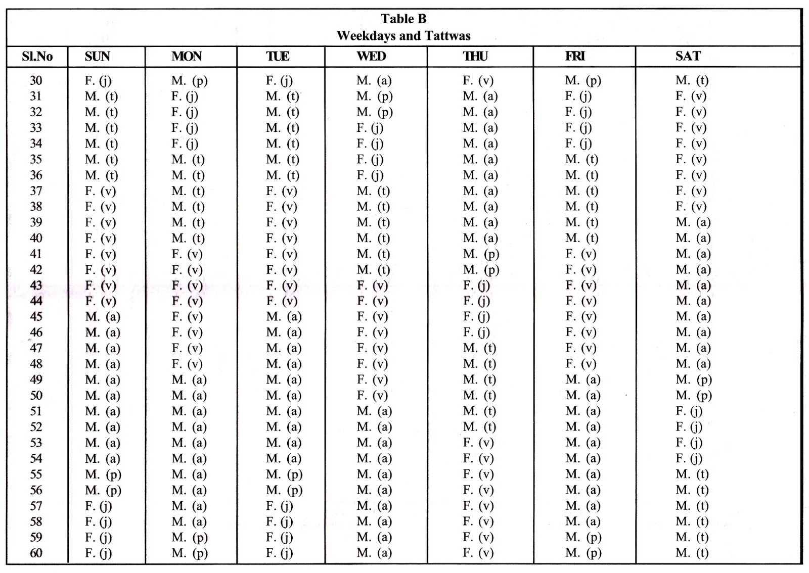The letters within brackets given just after M or F denote the particular Tattwa ruling at that time of birth.