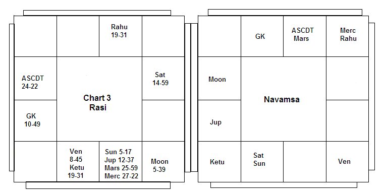 Noted physician and New Age author Deepak Chopra (Chart 3) has a combusted Jupiter in the 9th. The Dasa of Jupiter operate from 1983 to 1999 and in this period Chopra acquired world-wide name and fame through his books. The Way of the Wizard, Return of the Rishi, Ageless Body Timeless Mind and The Seven Spiritual laws of Success were some of the best sellers he authored in this period. Needless to say, combust Jupiter did not affect his career growth. On the other hand, he climbed greater heights in Jupiter Dasa.