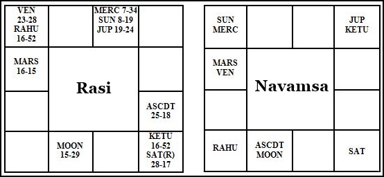 The Ascendant Leo is a powerful sign by itself; it is rendered even stronger by the aspect of Yogakaraka Vargottama Mars. Mars as 9th lord in the 7th influencing the Ascendant, the Ascendant lord, the 10th house and its occupants is an important factor that contributes to the spiritual potential of the chart. Any chart for that matter whose Ascendant or its ruler is connected favourably with the 9th lord carries in it, whether apparent or not, spiritual inclinations. Here Mars as 9th lord has a dominant role in influencing the chart as a whole.
