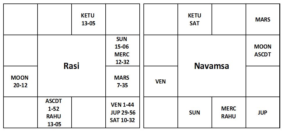 Saturn and Moon in the Ascendant, while trines are occupied by the Sun and Jupiter and Mars simultaneously in the 10th – Raja Yoga.
